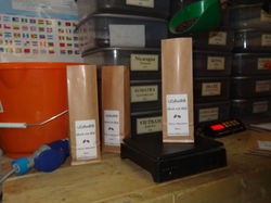 Everything they do is by hand from weighing the green beans into batches of 2kgs, which they hand roast, watching carefully as the beans slowly turn from their grey green raw self into dark richly roasted toasty beans. Once the beans have cooled they are poured into the waiting packs and then lovingly labelled and sealed, ready to be sent off the same day they were roasted.